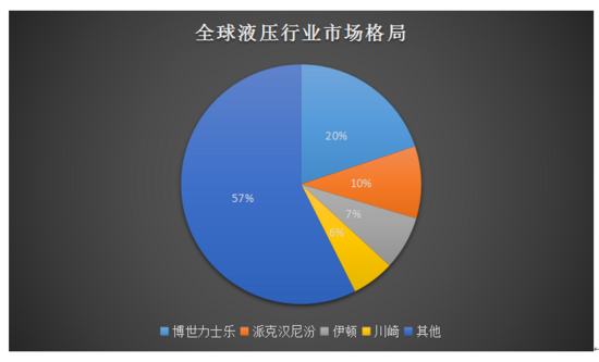 从液压系统看,我国液压件行业呈现出普通液压件结构性过剩、产品同质化竞争严重与高端液压件结构性短缺、大量依赖进口共存的局面。目前全球液压行业集中度较高,全球龙头企业集中于日本、美国和德国,包括博世力士乐、派克汉尼汾、伊顿和川崎四家公司,2020年其市占率分别为19.7%、9.7%、7.2%和5.7%,总计市场份额达42.3%。