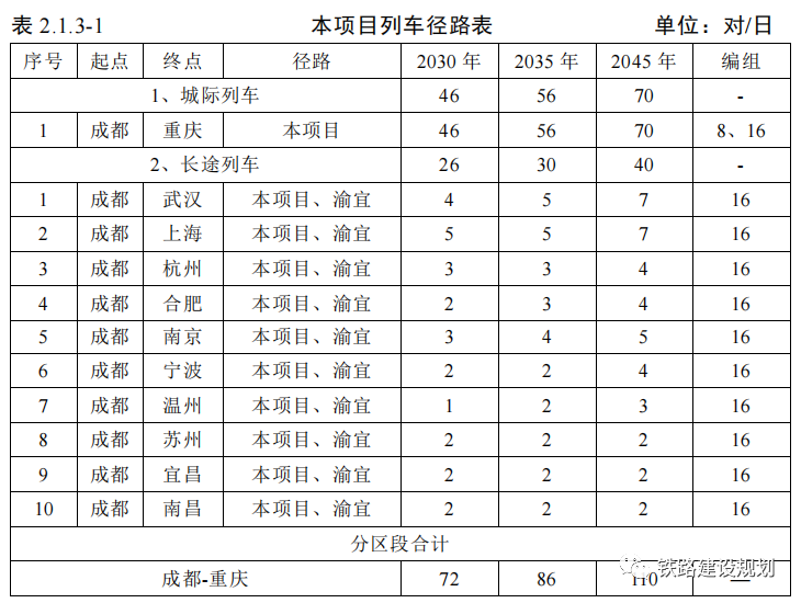 跨线长途列车:为满足本线对外客流需求,开行成都至沿江方向长途动车。近、远期开行30、40对/日。根据以上分析,本项目近、远期列车开行径路及对数如下表所示。其中近期昼间开行80对/日、夜间开行6对/日,远期昼间开行103 对/日、夜间开行7对/日。