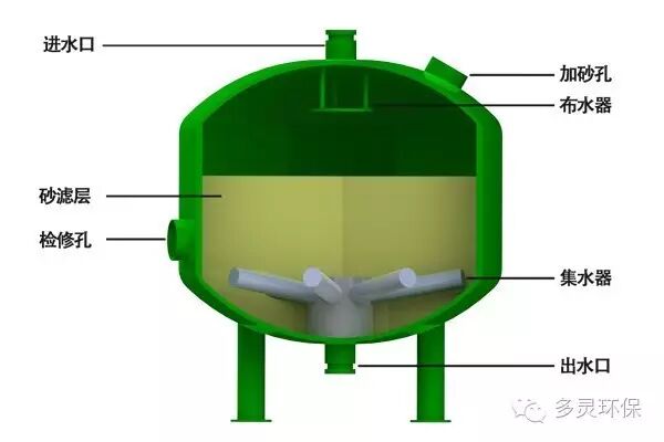砂石过滤器是利用砂石作为介质进行过滤的装置。主要由罐体进水口、出水口、排污口、砂床等部分组成。见下图: