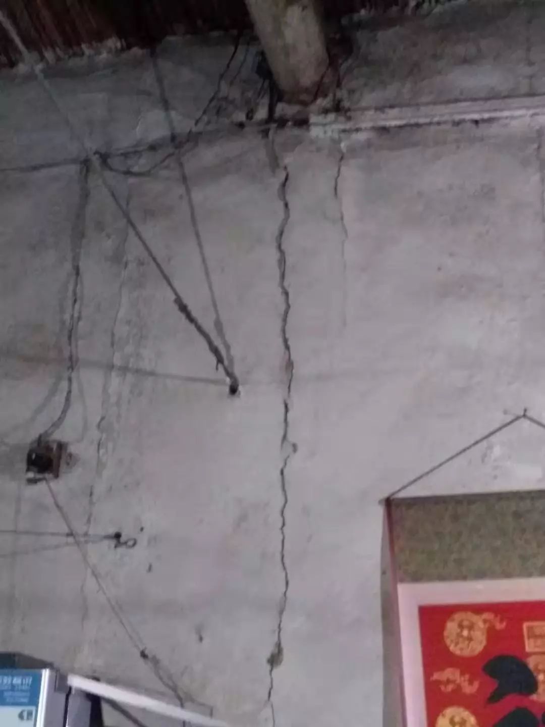 (新庄村村民家被震裂的墙壁,已用绳索拉起固定)