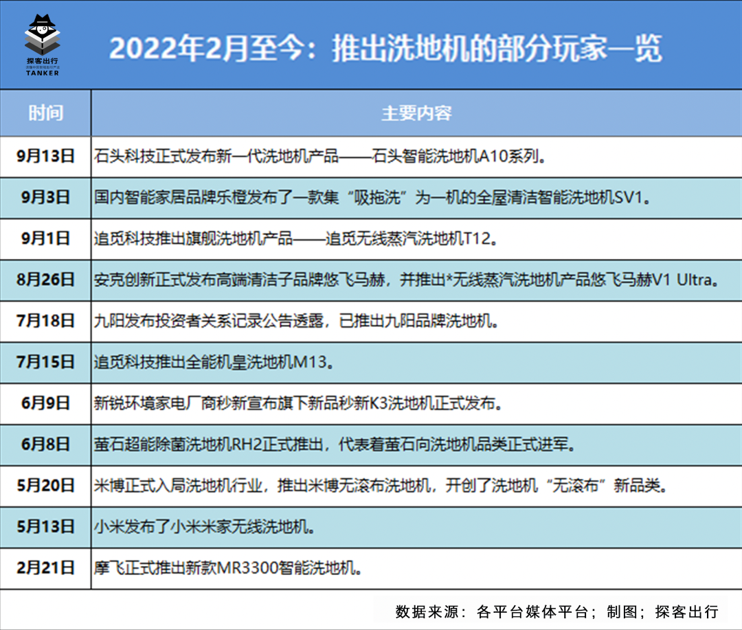 伴随厂商们纷纷杀入,洗地机产品上新节奏也不断加快。据「探客出行」观察,今年以来,小米、石头、追觅、九阳、萤石、米博等诸多企业都陆续推出了自家的洗地机产品,加速布局洗地机领域。