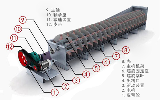 它是在一个倾斜的半圆形槽内安装有纵向长轴,轴上安装有旋转叶片,通过上部的传动机构带动旋转,下部有螺旋提升装置。