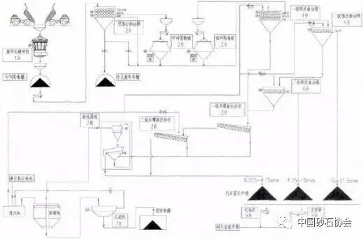 来自预筛分和中细破车间的物料通过一级筛洗振动筛筛洗后,大于 31.5 mm 的物料返回中细碎车间再此破碎。 小于 4.75 mm 的物料随洗石废水一起 送 入 水 洗 砂 车 间 的 双 螺 旋 洗 砂 机 进 行 洗 砂 。4.75~31.5 mm 的骨料输送至二三级成品振动筛进一步筛洗。 经过二三级筛洗后的 15~31.5 mm 和4.75~15 mm 骨料送至各自的成品 堆场 。 筛下的小于 4.75 mm 的含泥细粉随洗石废水也一起送入水洗砂车间的双螺旋洗砂机进行洗砂。
