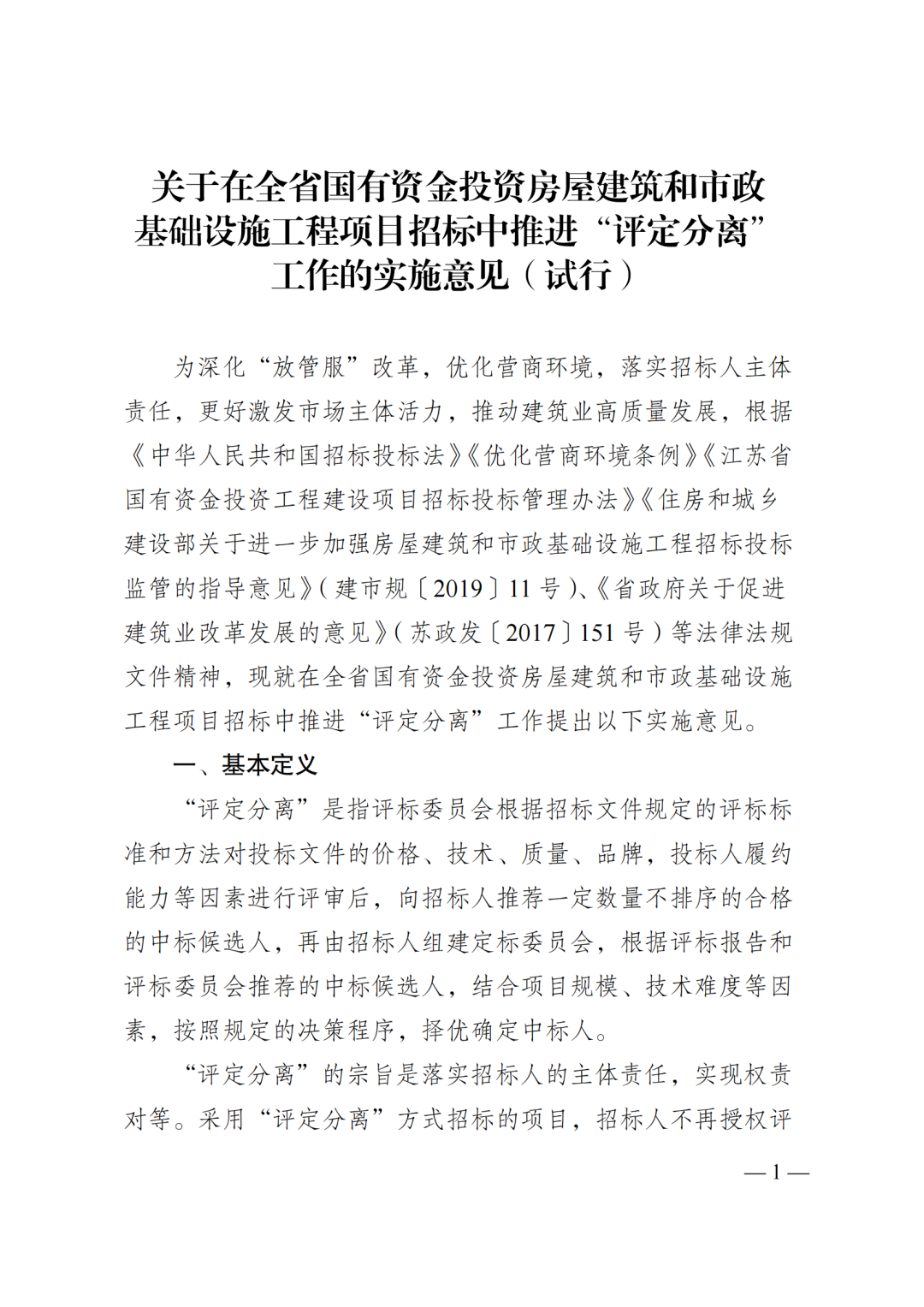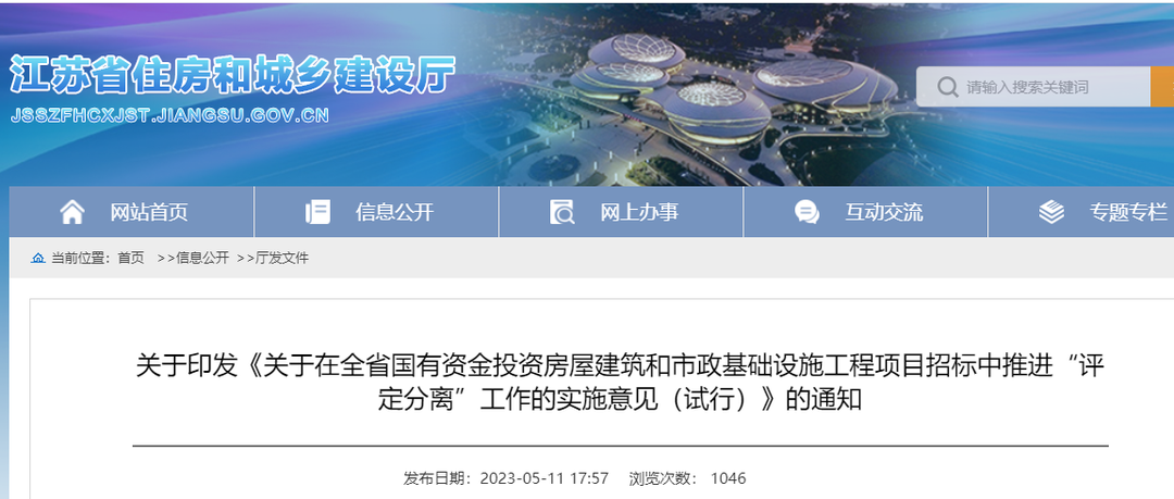 近日,江苏省住建厅正式印发《关于在全省国有资金投资房屋建筑和市政基础设施工程项目招标中推进“评定分离”工作的实施意见(试行)》(苏建规字〔2023〕2号),本意见自2023年7月1日起实施,有效期至2025年6月30日。