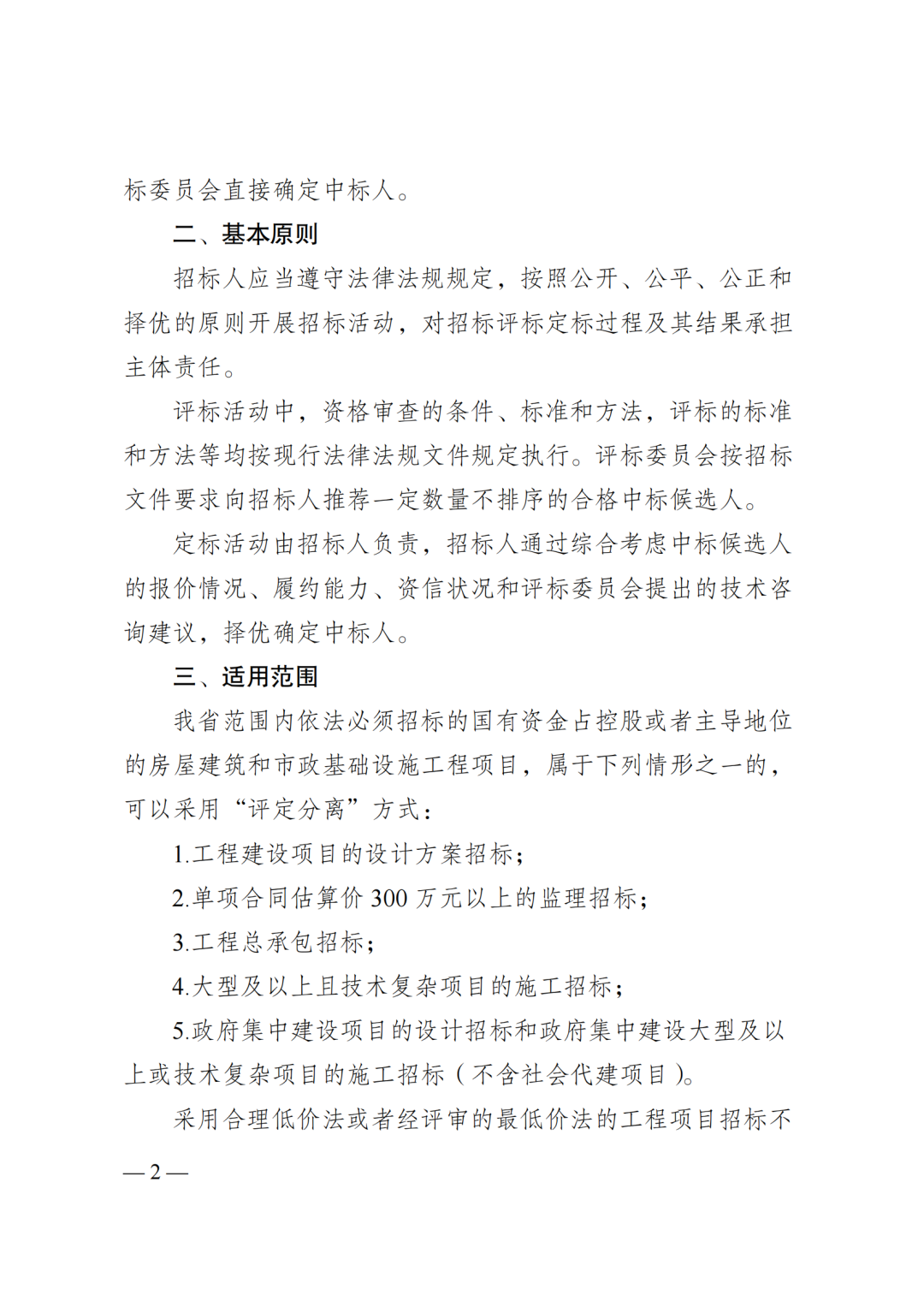 1.工程建设项目的设计方案招标;2.单项合同估算价300万元以上的监理招标;3.工程总承包招标;4.大型及以上且技术复杂项目的施工招标;5.政府集中建设项目的设计招标和政府集中建设大型及以上或技术复杂项目的施工招标(不含社会代建项目)。采用合理低价法或者经评审的最低价法的工程项目招标不适用“评定分离”方式。