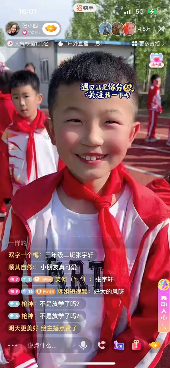 “翻江倒海”、“赶小猪”、趣味运球、冠军运动员分享课、环保主题互动课……初夏午后,泉庄镇中心小学的趣味活动正在开展。在快手用户“张小四”的实时直播中,教室里、操场上的孩子们绽放着纯真的笑脸。短短两小时,这场充满童趣的直播吸引了1525.6万网友观看,点赞数超过155.1万。
